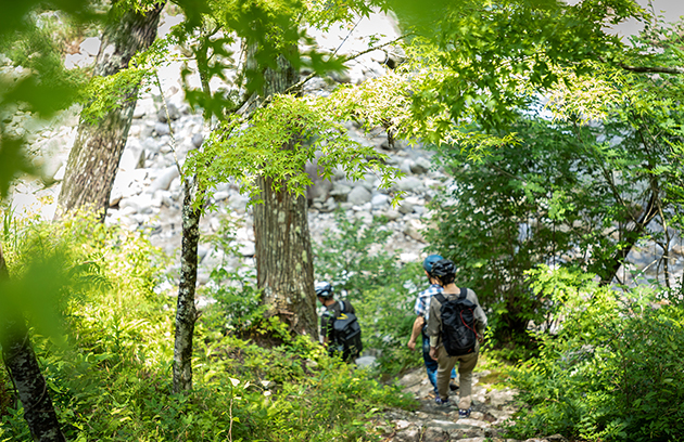 川のせせらぎや林道の木漏れ日、高台から望む景色など、